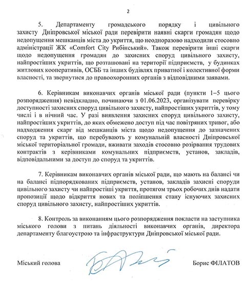 В оприлюдненому ним розпорядженні, зокрема, йдеться що департаменти ЖКГ, охорони здоровʼя, гуманітарної політики, адміністративних послуг, а також молодіжної політики та національно-патріотичного виховання повинні забезпечувати цілодобовий доступ до укриттів у підпорядкованих їм будівлях. Також департамент громадського порядку і цивільного захисту перевірить всі скарги містян щодо недопущення до сховищ. Результати передадуть до правоохоронних органів, а з порушниками серед керівників комунальних підприємств, установ і закладів невідкладно розірвуть трудові контракти.