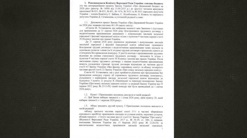 За його даними, 11 листопада комітет Верховної ради України з питань освіти, науки та інновацій запропонував доповнити закон про державний бюджет 2026 року нормами, які стосуються трудових прав педагогічних працівників. Пропозицію планували розглянути 2 грудня, але не розглянули.