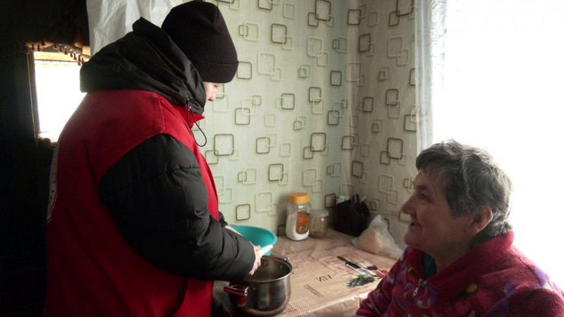 Олена Курневич готує їсти для місцевої жительки Марії. Суспільне Рівне