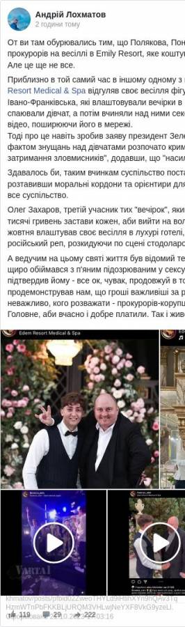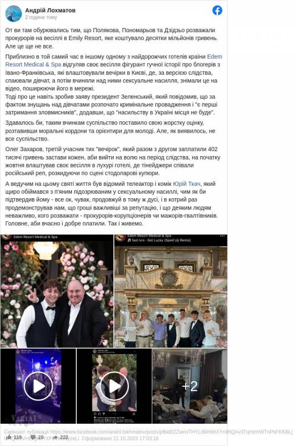 «На початку жовтня влаштував весілля у лухарі готелі, де тінейджери співали російський реп, розкидуючи по сцені стодоларові купюри», — написав Лохматов.