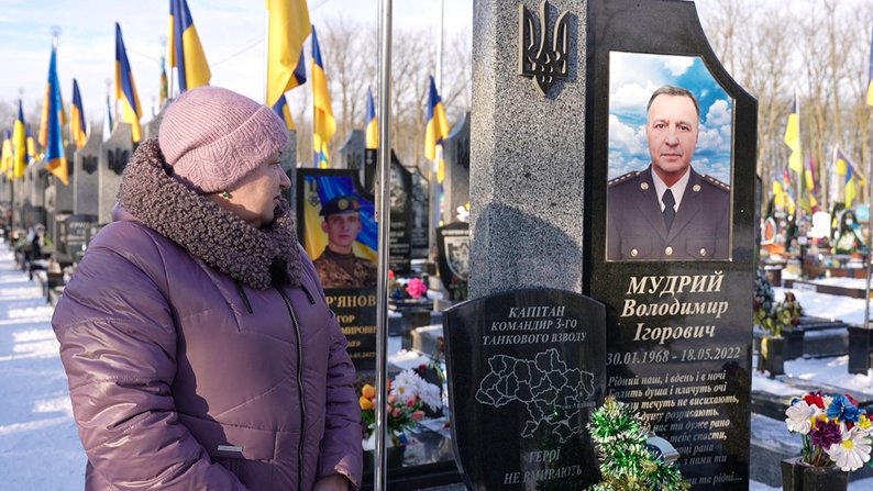 На Далекосхідному кладовищі до могили чоловіка Володимира прийшла Олена Мудра. З її слів, чоловік добровільно пішов на фронт після повномасштабного вторгнення РФ, загинув у 2022 році в Авдіївці на Донеччині.