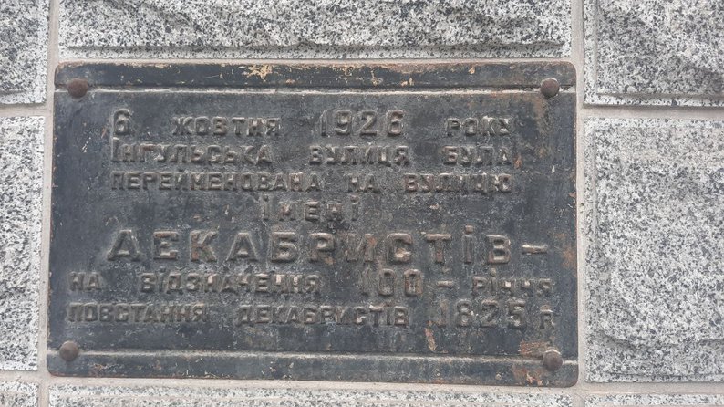 - меморіальна дошка про колишню вулицю Декабристів на приміщенні ресторанного комплексу на вулиці Володимира Панченка;