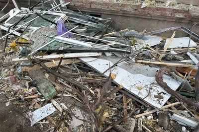 Чоловік прибирає біля будинку після обстрілу Одеси вночі 24 квітня 2026 року. Суспільне Одеса