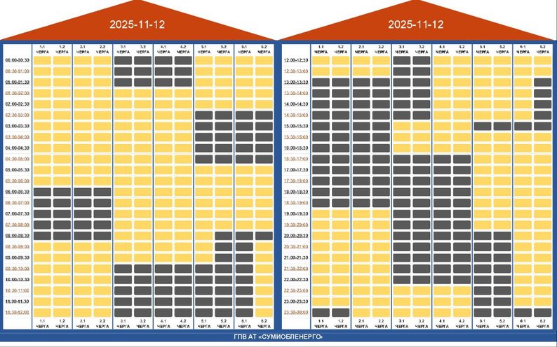 Графік вимкнення світла на 12 листопада. АТ «Сумиобленерго»