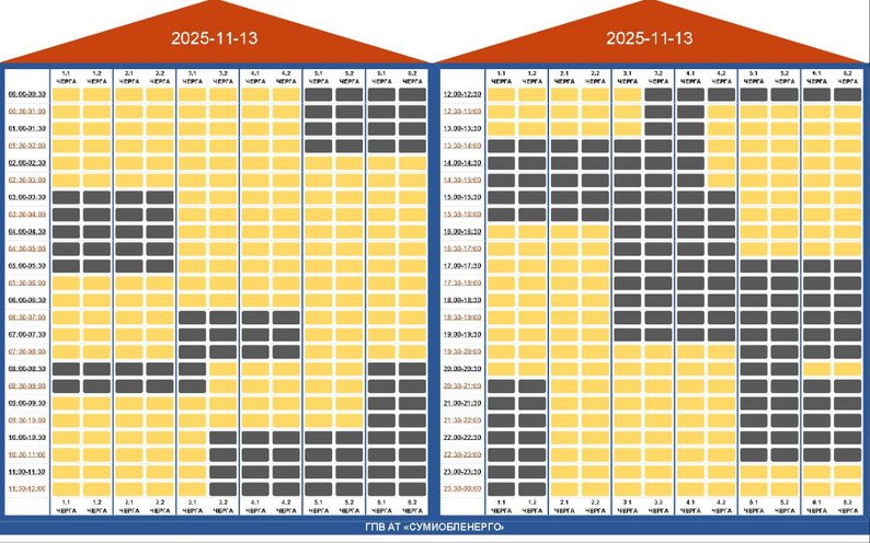 Графіки погодинних відключень на 13 листопада. АТ «Сумиобленерго»