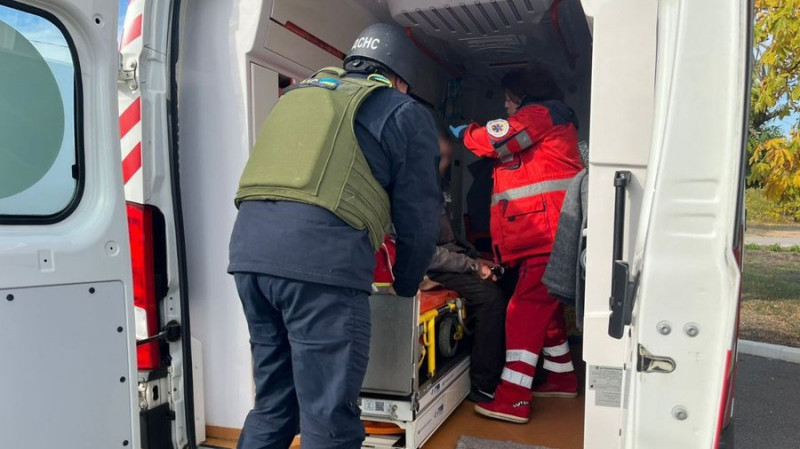 Рятувальник та медикиня надають допомогу пораненому через обстріли Нікопольщини, 18 жовтня 2025 року. Telegram/Владислав Гайваненко