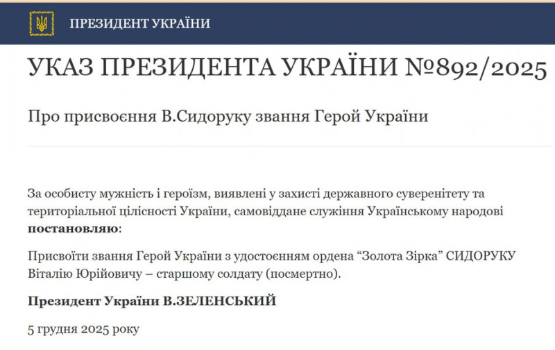 Скрін указу президента про присвоєння звання Героя України Віталію Сидоруку. Інтернет-представництво президента
