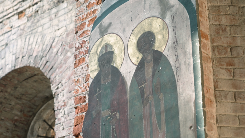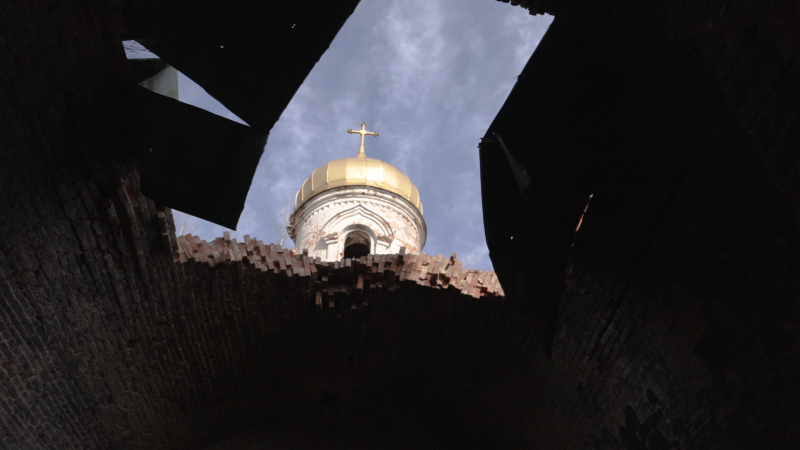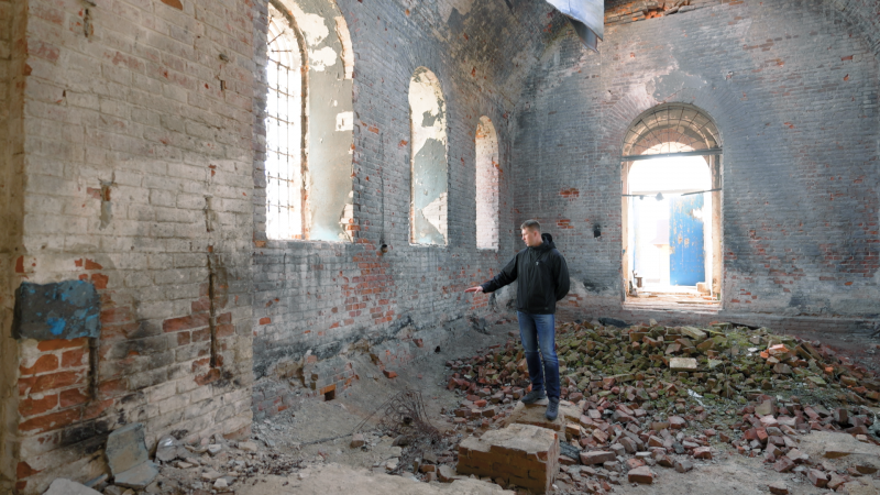 Всередині церкви у Лукашівці Олексій намагається уявити, де допитували його батька у 2022-му. 23 березня 2026 рік. Суспільне Чернігів