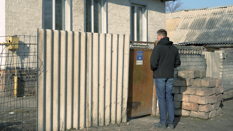 Олексій Ануля підійшов до будинку родини Лутченків у Лукашівці, які одні з останніх спілкувалися з його батьком. 23 березня 2026 рік. Суспільне Чернігів