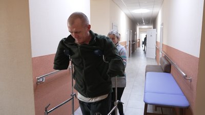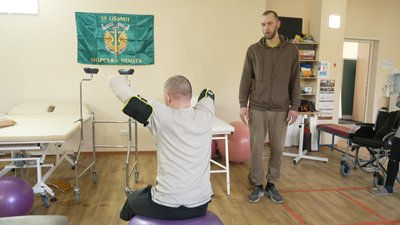 Сам Володимир виконує всі завдання реабілітологів і вчиться заново ходити. Каже, що здаватись не планує. Попереду — протезування і тривала реабілітація.