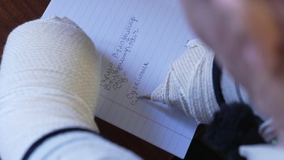 "Я з ним скрізь. Мені сказали через чотири дні, що він лежить у лікарні. І з того дня я їжджу за ним скрізь. Діти в Запоріжжі, спілкуємося по телефону, по вайберу", — сказала Олена Волошина. — Непросто, зовсім непросто. Були істерики, паніки. Все було. Стараємося з цим боротися. Боремося, думаємо, що буде краще. Можливо поставлять протези. Буде краще".