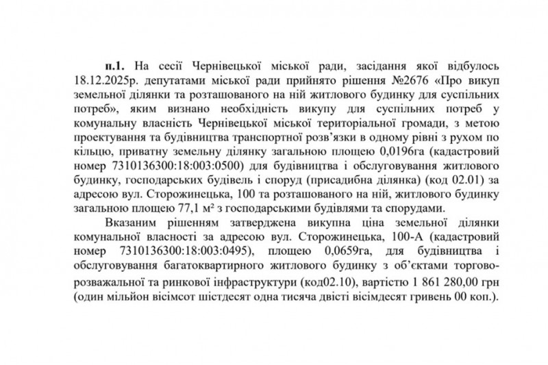 На грудневій сесії депутати підтримали рішення про викуп приватної ділянки на вулиці Сторожинецькій, 100-А площею 196 квадратних метрів з житловим та господарськими будівлями на ній. Вартість цієї ділянки – понад 1,8 мільйона гривень. Водночас викуп передбачає укладання договору міни – власнику віддадуть рівноцінну ділянку.