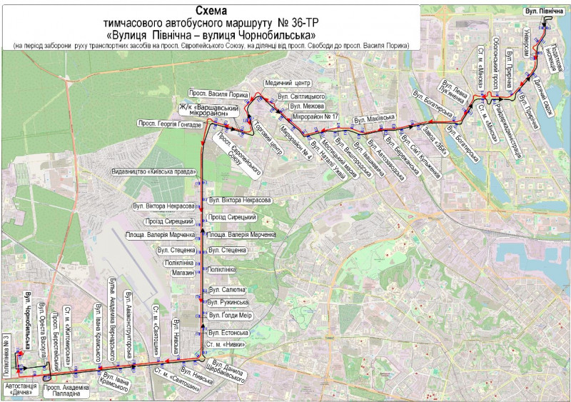 автобус № 36-ТР — від вул. Чорнобильської до вул. Івана Виговського за власним маршрутом, далі просп. Європейського Союзу — просп. Василя Порика — просп. Свободи — просп. Європейського Союзу, далі за власним маршрутом;