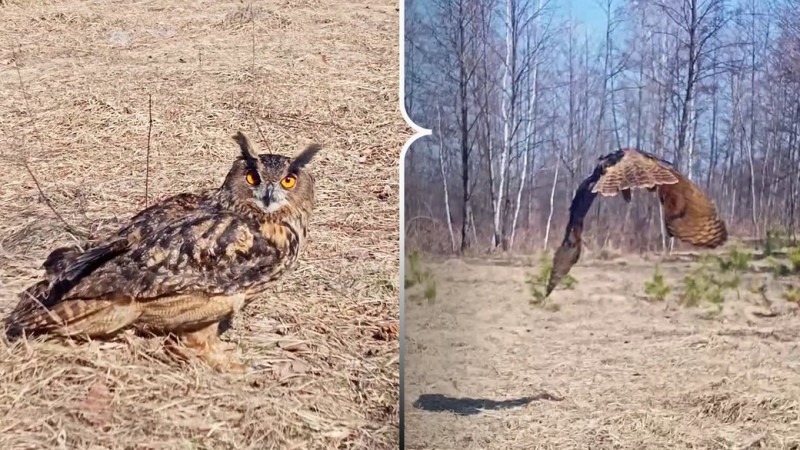 Пугач, якого випустили у природу. Колаж: Суспільне Рівне, фото: скрини з відео у Facebook Олександра Добринського