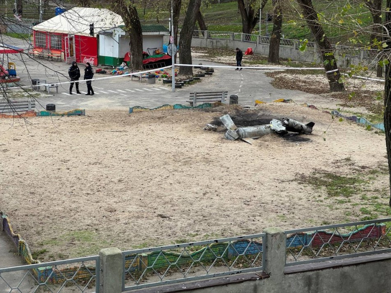 Уламки ракети впали на дитячому майданчику. Також через обстріл пошкоджено будівлі на території парку.