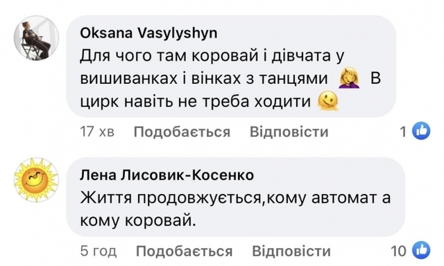 У соціальних мережах виникло чимало запитань від українців щодо одягу, танців, короваю і загалом доречності проведення такого заходу. « щось феодально-дике коли діти, юні дівчатка в тоненьких сорочечках і, якшо я не помиляюся, з голими ногами на холоді (а нині вже не є тепло, 10-15 градусів) танцюють з вимушеними посмішками перед «важними тіпами», будь якими.