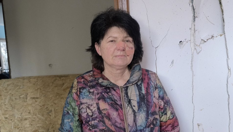 Наталя розповідає, була вдома, коли стався вибух. Жінка дістала травми обличчя, медики наклали шви. Згадує, після атаки про своє поранення й не думала, шукала кота ц собаку, допомагала сусідам.