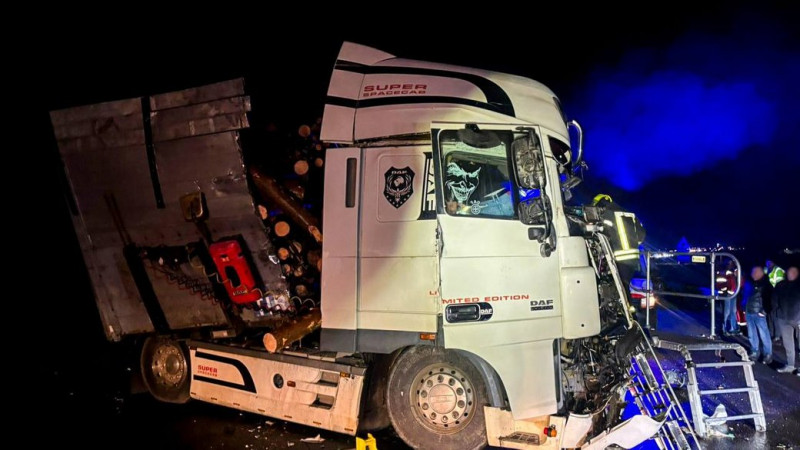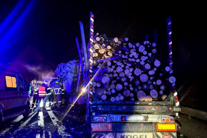 На фото видно, що одна з вантажівок перевозила деревину.