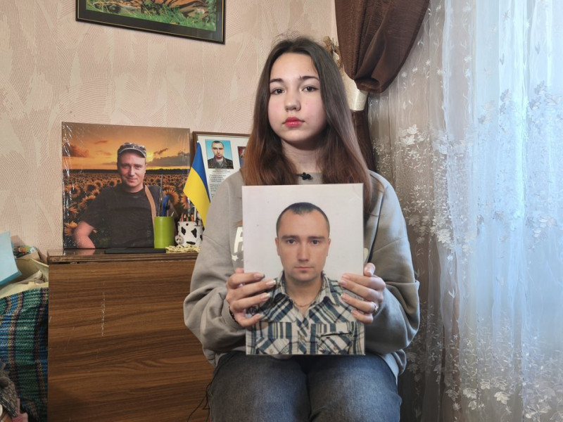Поліна Костріченко з фото батька. Суспільне Дніпро/Олексій Коренєв