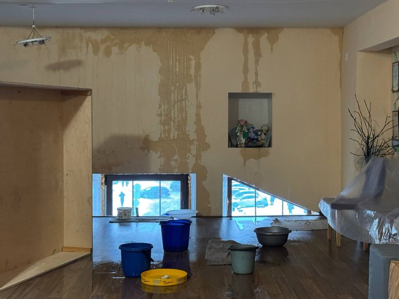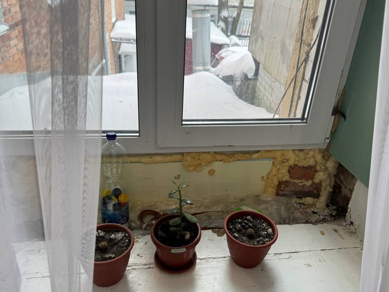 "Стоїть вікно, яке поставили. Раніше тут були дуже круті історичні вікна, адже це старе приміщення і памʼятка архітектури. Поставили більш сучасні вікна, але їх навіть не встановили. Проробили відкоси, нічого не зробили, між підвіконням і вікном велика щілина, яка пропускає сюди холод, і завісили все це великим банером. Тепло фактично виходить з театру. Ось наші актори взяли ляльку і закрили дірку. Підставили спеціально відра, зараз тут стіна вся мокра. Дуже багато електрообладнання, і це все може замкнути. Це все безпека", — розповів Олександр Дмитрук.